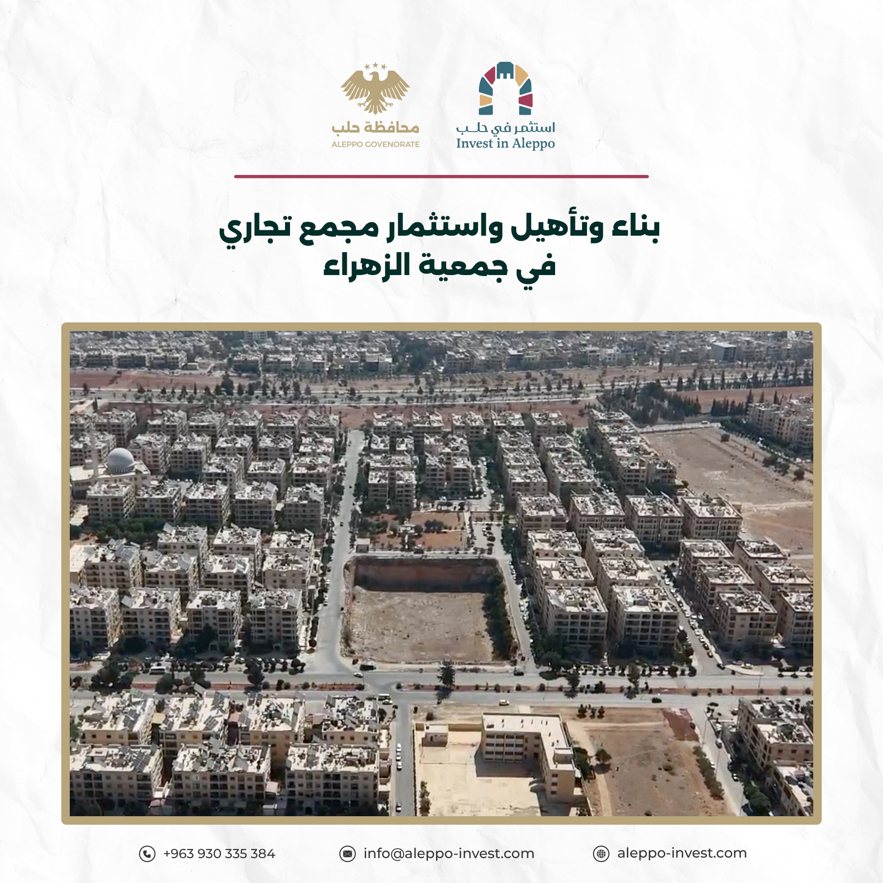 إعلان مشروع بناء واستثمار مجمّع تجاري في جمعية الزهراء على أجزاء المحاضر من رقم /3103/ حتى /3110/ ، وذلك وفق نظام استثمار BOT.