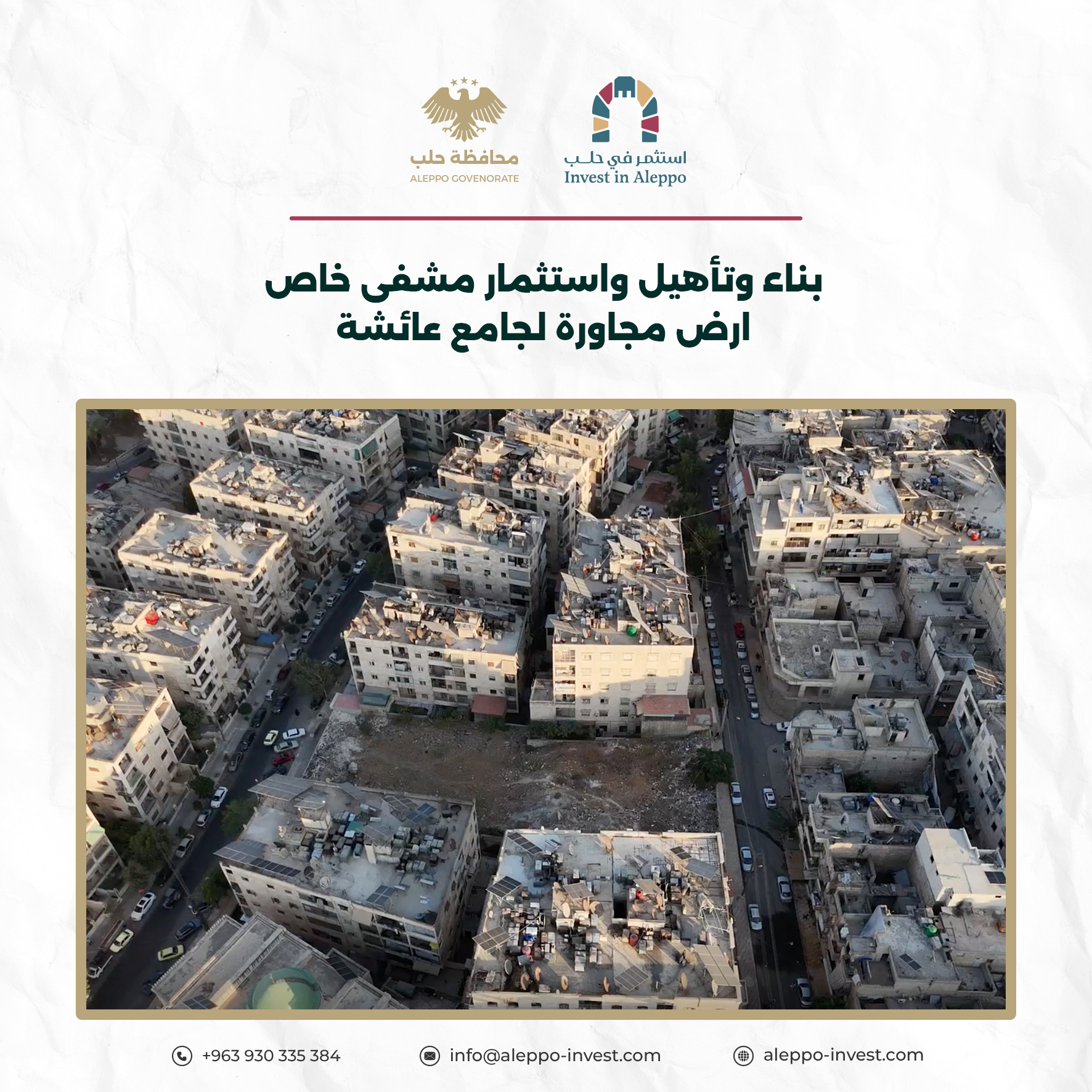تأهيل واستثمار الموقع كمشفى خاص او مركز طبي متخصص أو مركز جراحة اليوم الواحد أو مركز غسيل كلى وفق الاختصاصات الطبية التي يقترحها المستثمر حسب متطلبات واشتراطات مديرية الصحة بحلب.