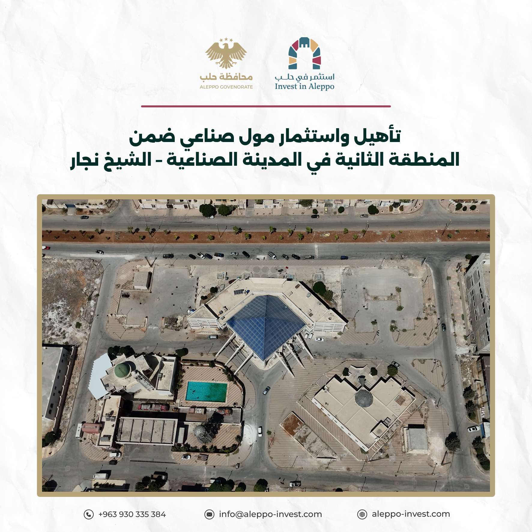 يهدف هذا المشروع إلى تصميم وإعادة تأهيل واستثمار المركز التجاري (مول صناعي) الواقع ضمن المنطقة الثانية في المدينة الصناعية الشيخ نجار بحلب، وفقًا للمواصفات المعتمدة، والاشتراطات الفنية والبيئية، بما في ذلك معايير السلامة، إضافة إلى أي تعليمات تصدر عن الجهات المختصة.
